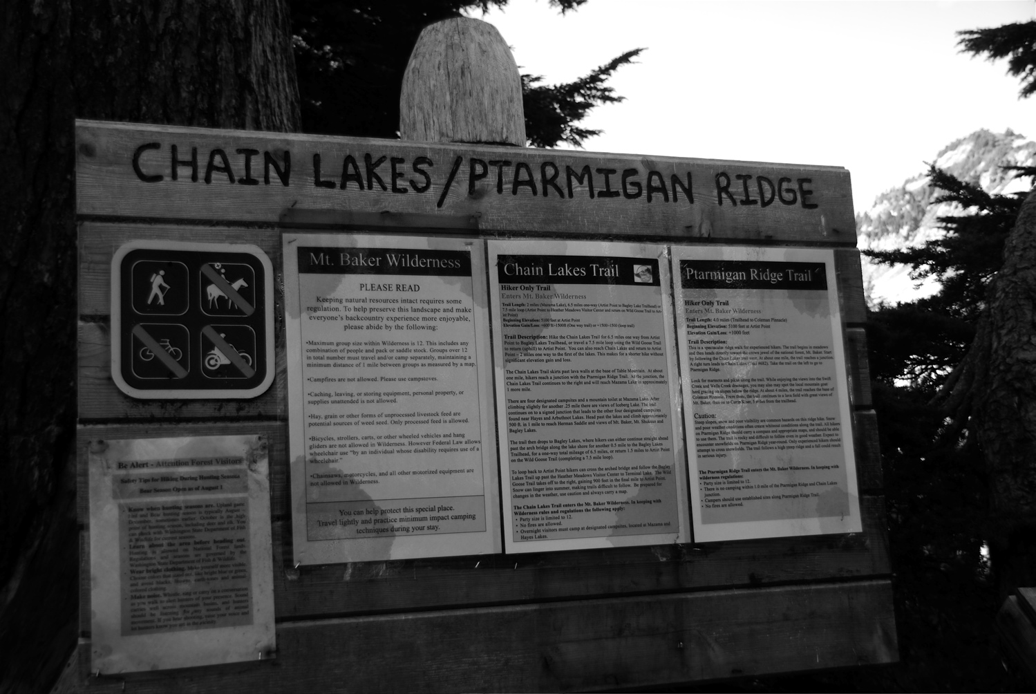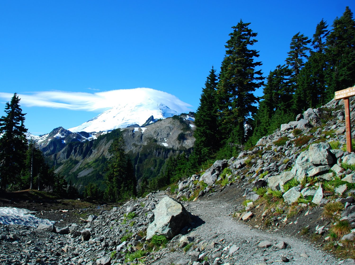 A couple of weeks ago we headed to Bellingham/Fairhaven. It's a good jumping off point to explore Mt. Baker and Artist's Point. Even from Bellingham, it's an hour and a half drive to Artist's Point (cuz you have to stop for coffee, of course). We planned to walk the Chain Lakes Trail until we were satisfied. It was more important to go for a pretty drive on rural roads and get outside than to clock lots of miles.As we started out on the Chain Links Trail, a large lenticular cloud hung over Mt. Baker. The cloud would remain right there for our whole adventure. But that's what part of makes mountains cool - those lenticular clouds.